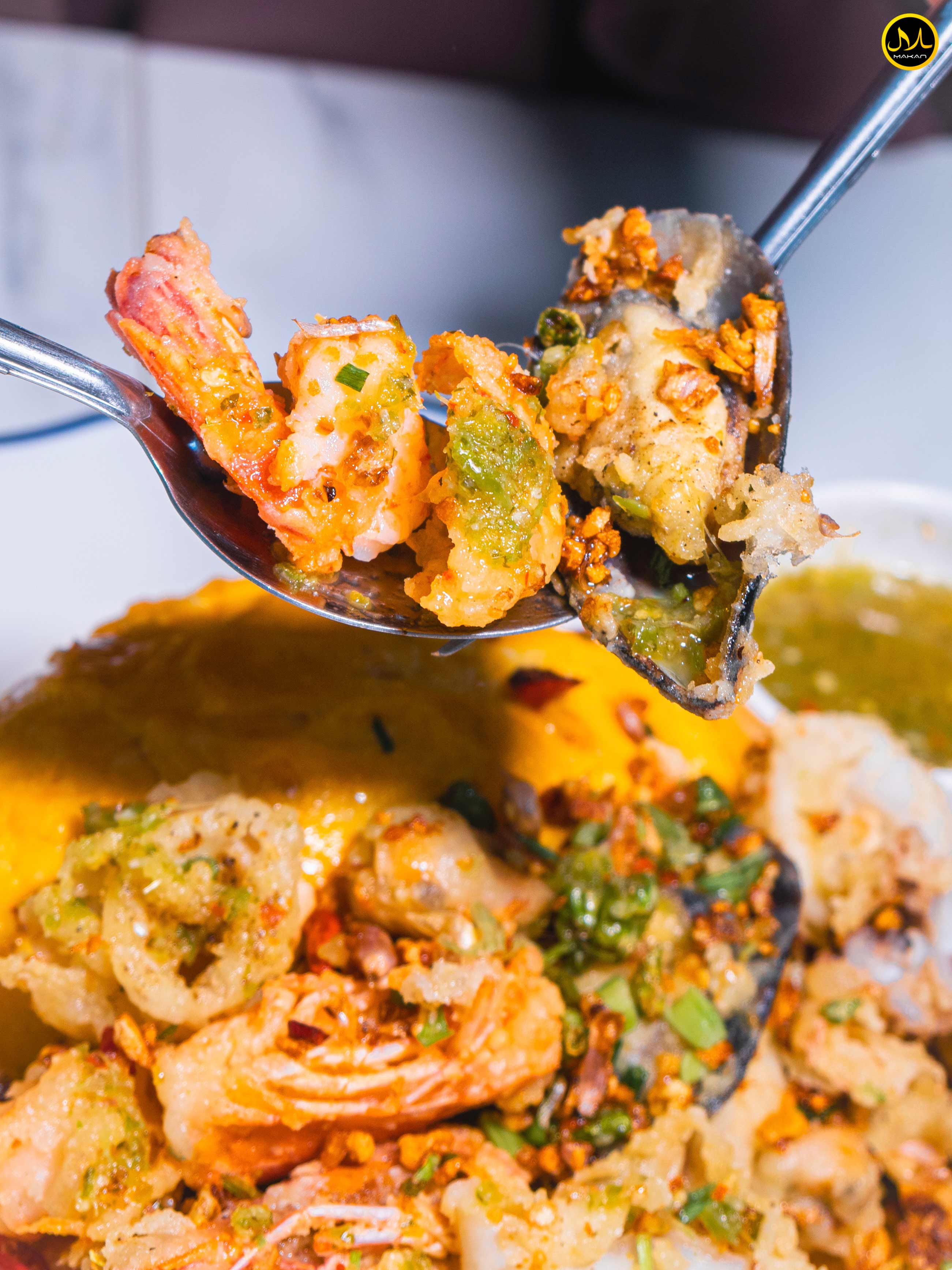 ข้าวทะเลคั่วพริกเกลือ: คนรักอาหารทะเลต้องฟิน กับกุ้งและปลาหมึกตัวโตๆ คั่วพริกเกลือหอมๆ รสชาติเข้มข้นถึงเครื่อง