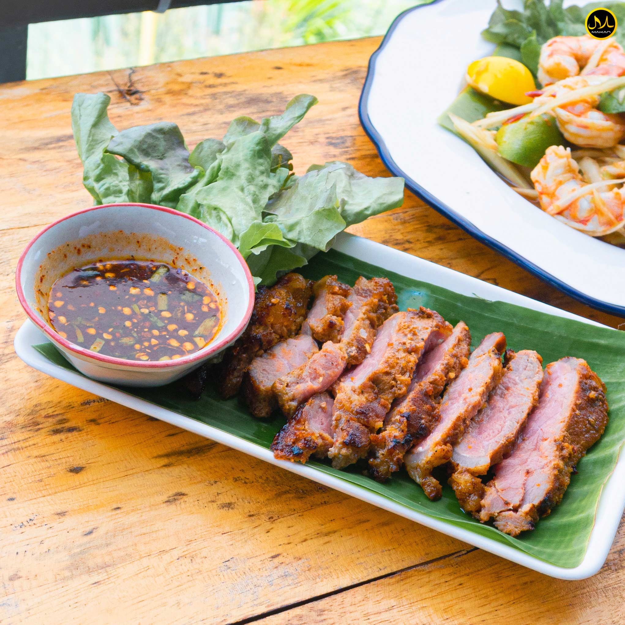 เนื้อย่างจิ้มแจ่ว: เนื้อย่างนุ่มๆ ชิ้นใหญ่ จิ้มกับน้ำจิ้มแจ่วรสแซ่บ เปรี้ยว หวาน เผ็ด ครบรส