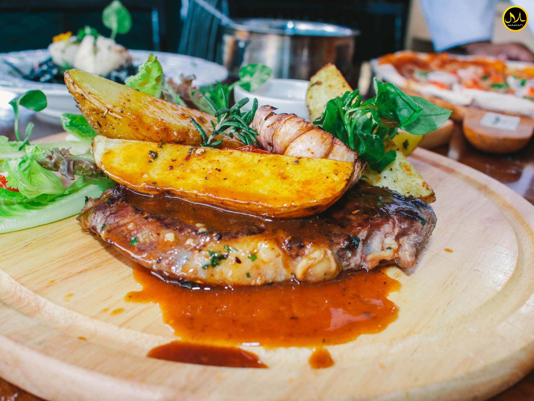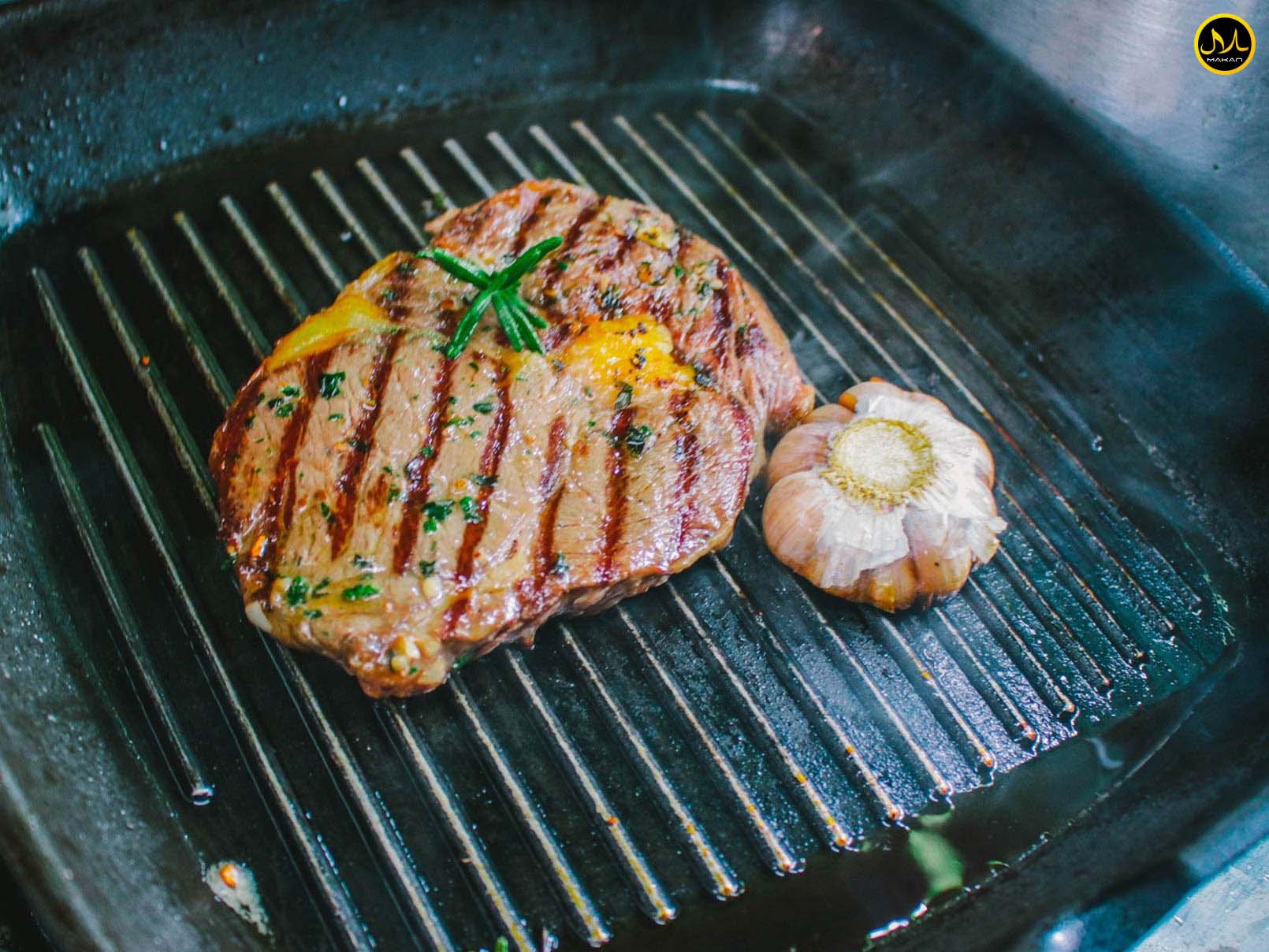 สเต็ก: สเต็กเนื้อนุ่มชุ่มฉ่ำ ย่างบนเตาถ่าน เสิร์ฟพร้อมเครื่องเคียง