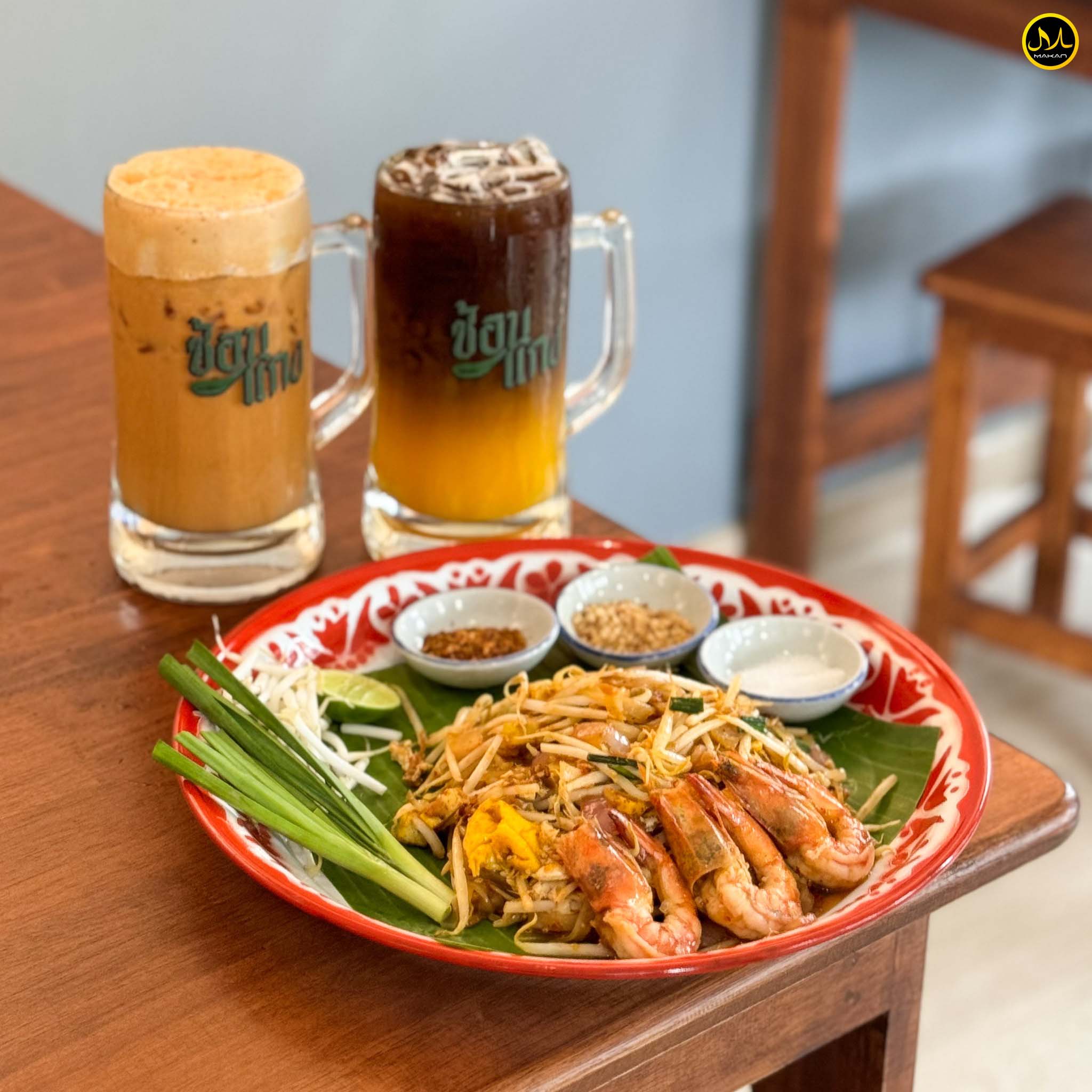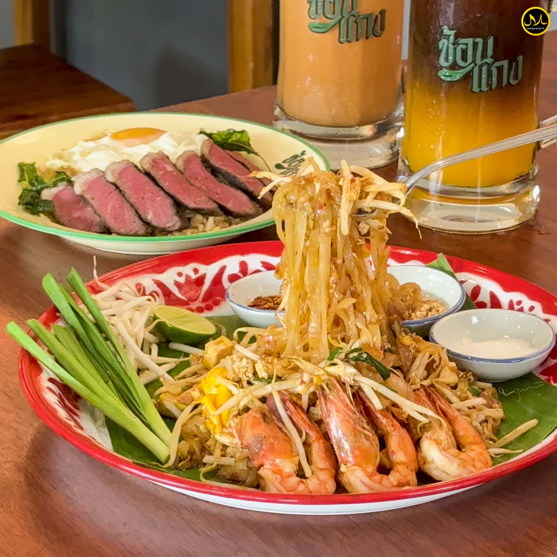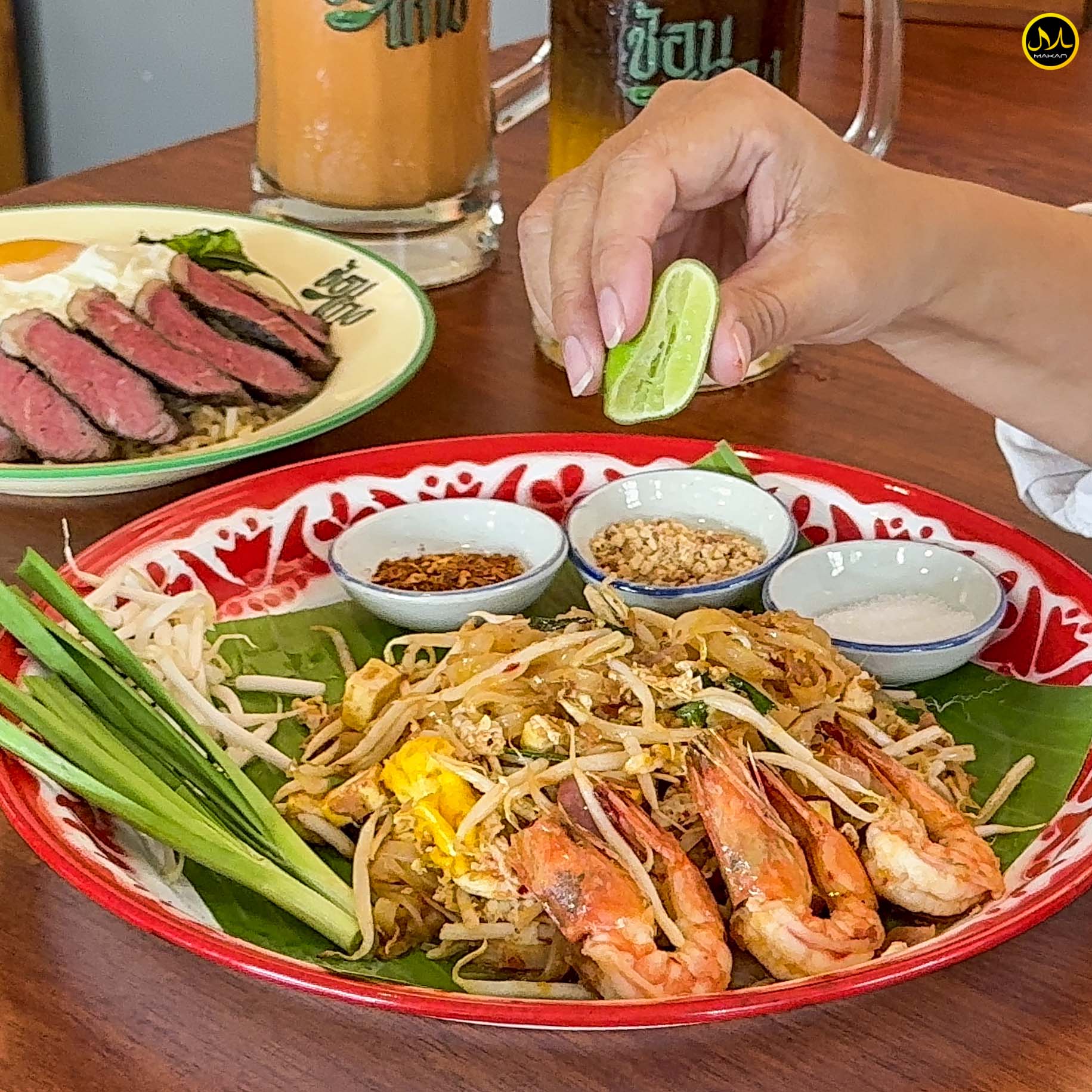 ผัดไทยกุ้งสด: เส้นจันท์เหนียวนุ่ม ผัดกับซอสผัดไทยรสชาติกลมกล่อม ใส่กุ้งสดตัวโตๆ