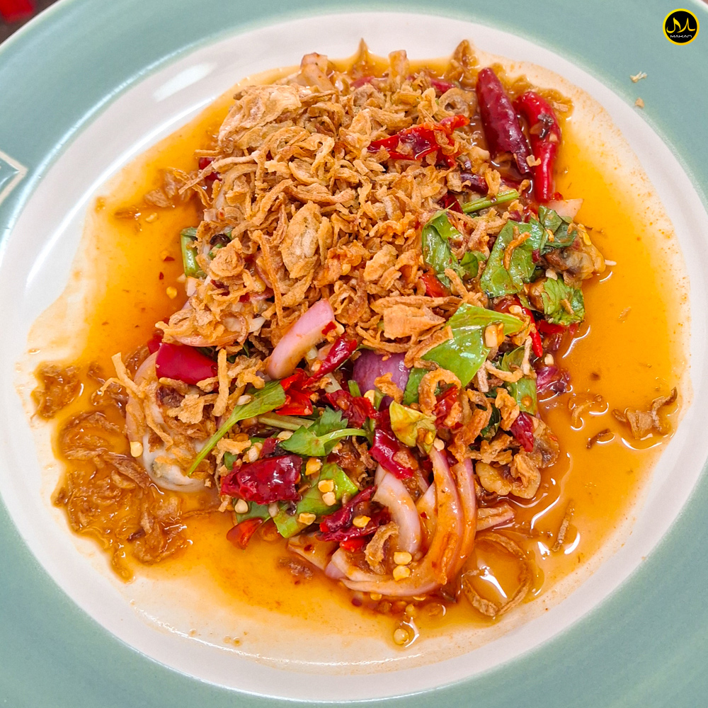 ยำหอยแครง: ยำพริกเผารสชาติเข้มข้น หอยแครงสด ๆ กินคู่กับหอมเจียวกรอบ ๆ ฟินมาก เมนูนี้แนะนำให้สั่งข้าวมาด้วย ...เปลืองข้าวแน่นอน!