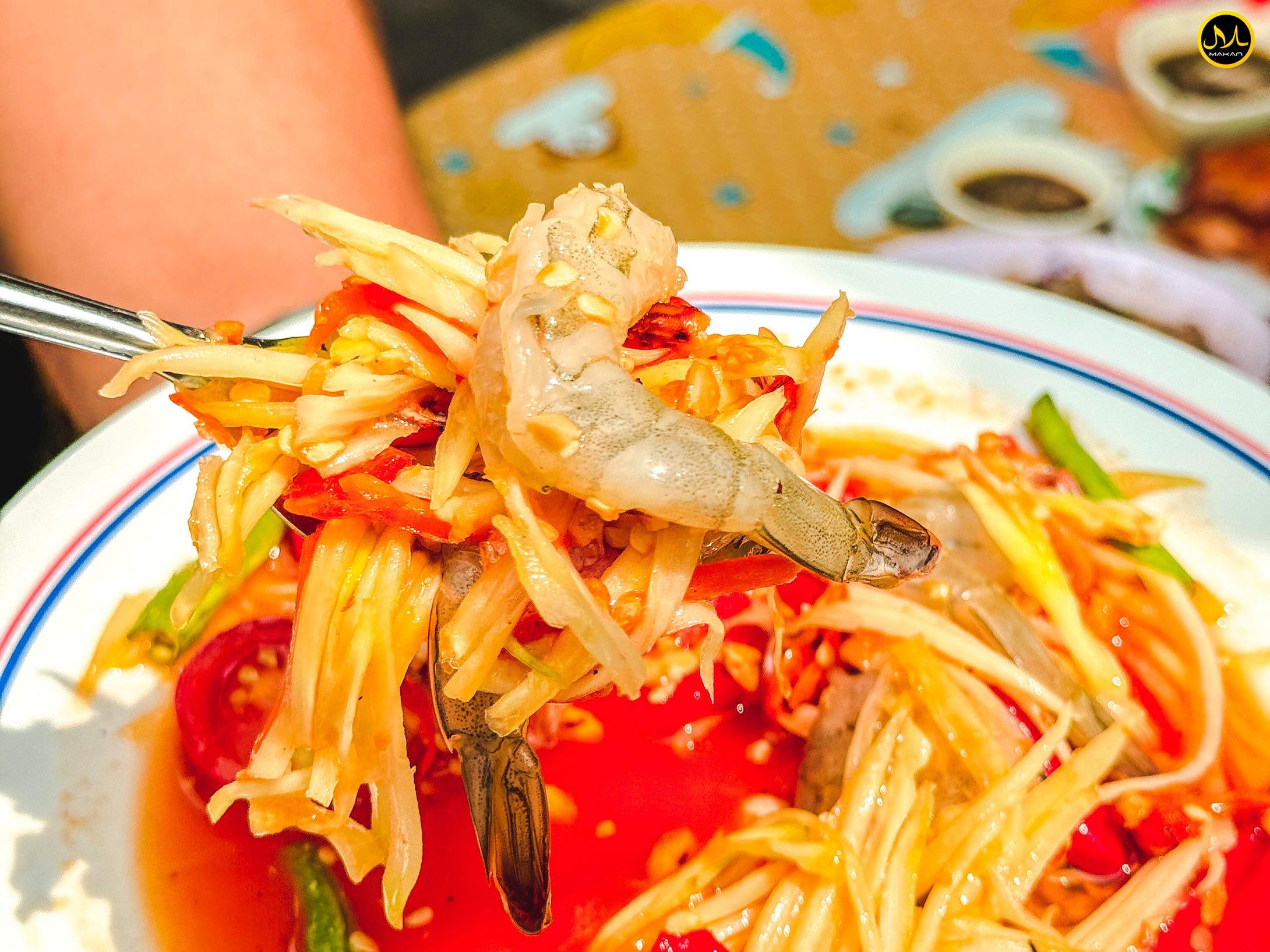 สำหรับใครที่ชอบรสชาติจัดจ้าน นัวร์ๆ ต้องเมนูนี้เลยค่ะ มะละกอกรอบๆ คลุกเคล้ากับน้ำปลาร้าหอมๆ รสชาติเผ็ดกำลังดี ที่สำคัญคือกุ้งสดมาก เนื้อเด้งๆ กินแล้วฟินสุดๆ ค่ะ