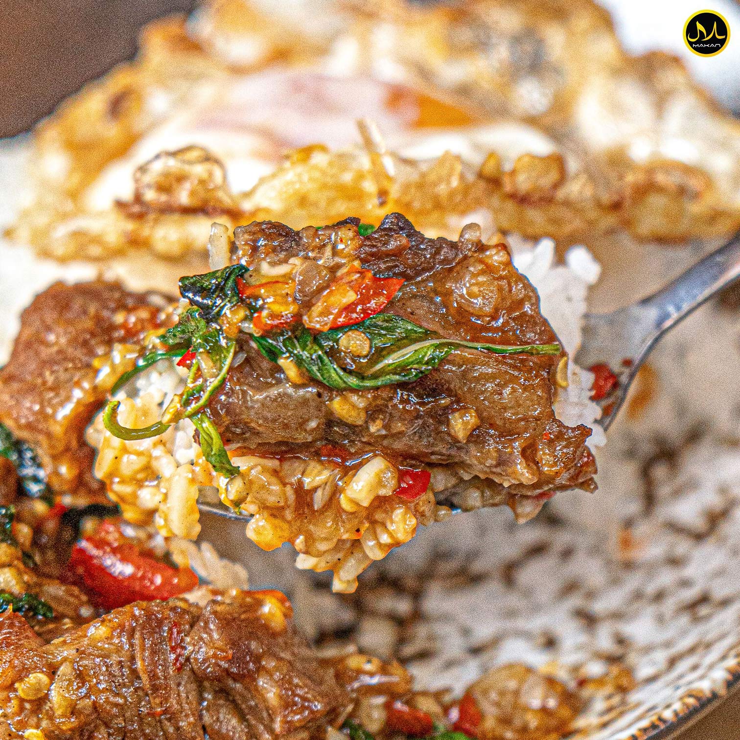 ข้าวกะเพราเนื้อตุ๋นไข่ดาว: เนื้อตุ๋นชิ้นหนา ดูมีมันแทรกนิดหน่อย แต่พอลองชิมแล้วคือนุ่มเกินคาด! หอมกลิ่นเครื่องกะเพราแบบไทยๆ กินกับไข่ดาวเยิ้มๆ ฟินสุดๆ ไปเลย
