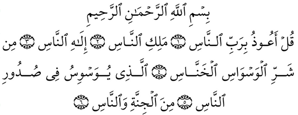 คำแปล : จงกล่าวเถิด(มูฮัมหมัด)ข้าพระองค์ขอความคุ้มครองต่อพระเจ้าแห่งมนุษย์ชาติ , พระราชาแห่งมนุษย์ชาติ , พระเป็นเจ้าแห่งมนุษย์ชาติ , ให้พ้นจากความชั่วร้ายของผู้กระซิบกระซาบที่หลอกล่อ , ผู้ซึ่งกระซิบกระซาบในหัวอกของมนุษย์ , จากญินและมนุษย์