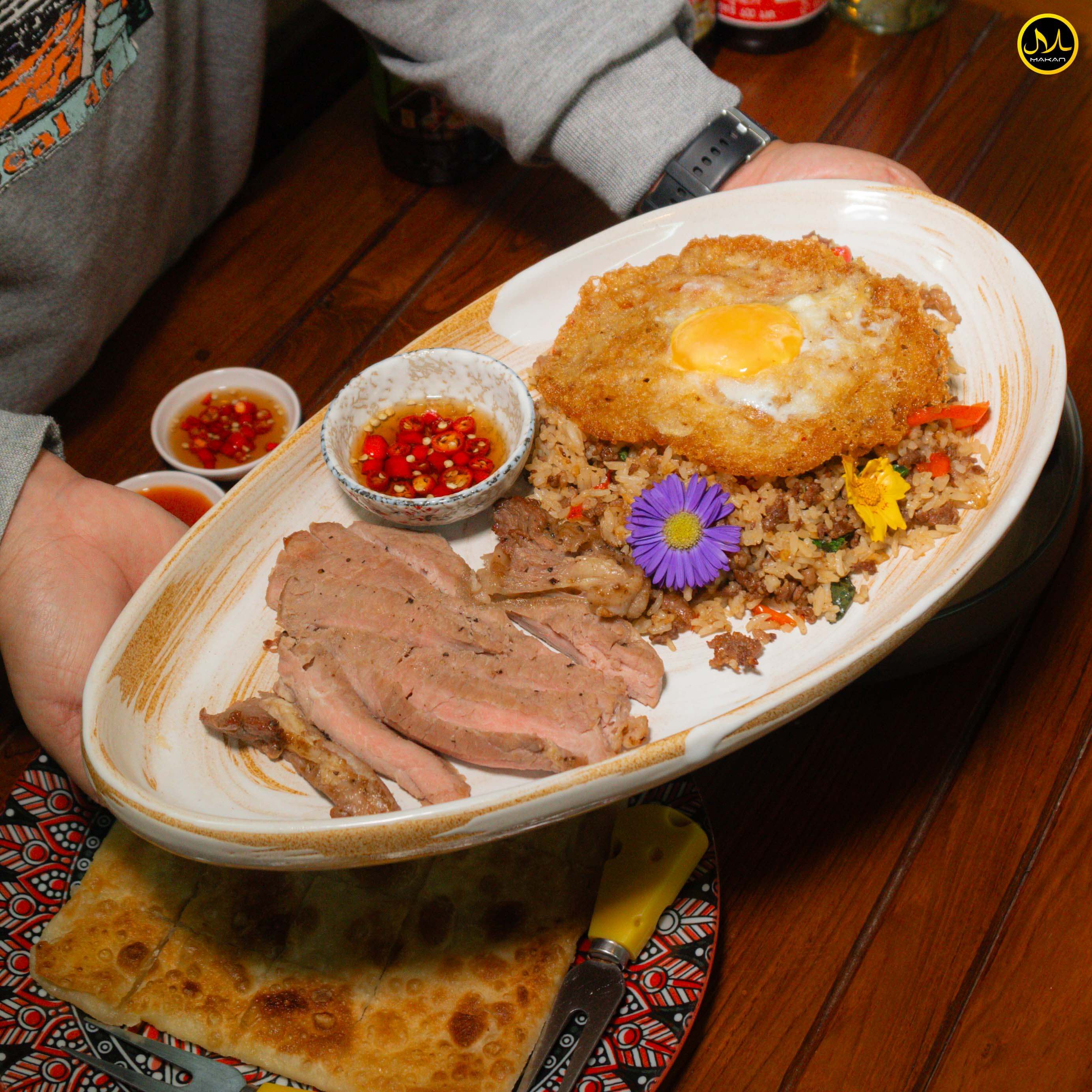 ข้าวผัดมันเนื้อคู่สเต็กเซอร์ลอยด์: เมนูสำหรับคนรักเนื้อแบบสุด ๆ! ข้าวผัดหอม ๆ คลุกเคล้ากับมันเนื้อหอม ๆ เสิร์ฟคู่กับสเต็กเซอร์ลอยด์ชิ้นหนา!